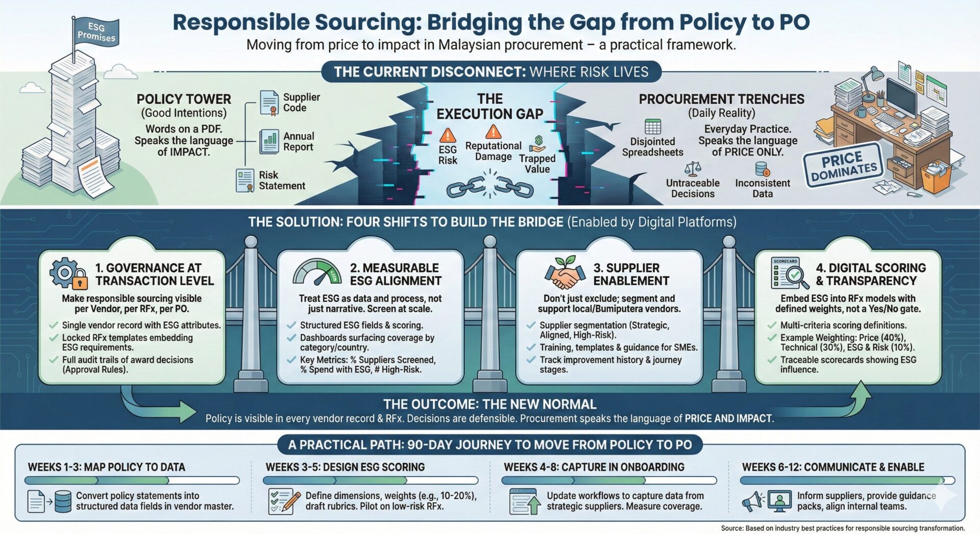 This explainer looks at how to move responsible sourcing from “nice words” to everyday procurement practice. It draws on what a bank like Maybank has been building in responsible sourcing—treating governance, ESG, supplier enablement and digital scoring as one system—and shows how a platform like ADAM-Procure can operationalise the same ideas.